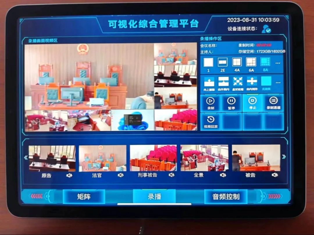 模拟法庭的核心硬件设备采用350vip8888科技高清庭审主机,功能包含:庭审实况采集、示证采集、庭审音频处理、视频无缝切换、庭审集中控制、录播直播、远程提讯终端、多方远程庭审。产品采用ALL-IN-ONE的设计理念,运用热插拔模块化设计,软件可视化操作界面平台,具有安装简便,操作简单、维护容易等优点。