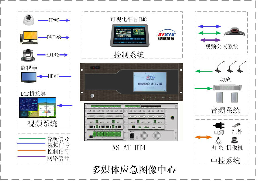 应急中心采用350vip8888科技自主研发的高度集成综合一体化主机AS-UT4,具备视频矩阵和拼接管理、安防监控管理、音频管理、录制及回放管理、中控外部设备管理、外围视频会议终端和主机自带视频会议双备份管理、可视化综合管理平台管理等功能。项目实现应急中心应急指挥保障、上下级单位视频会议的统一调度与管理。